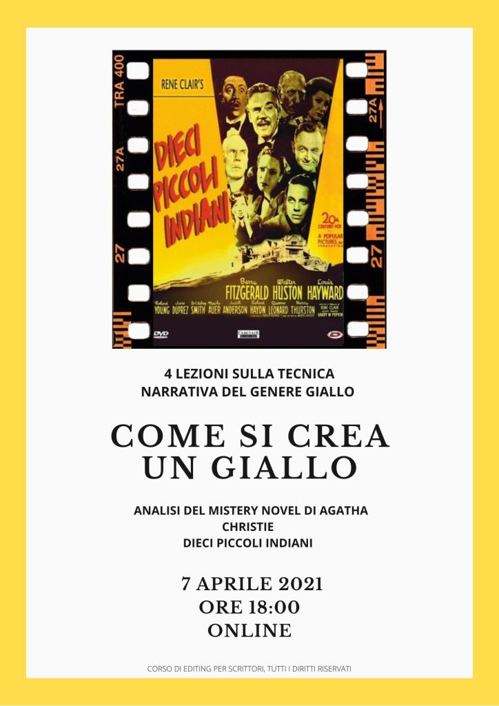 Siete pronti per un nuovo corso? Stavolta parleremo della tecnica narrativa che presiede alla costruzione di una storia di genere giallo. Lo faremo aiutandoci con una giallista famosissima, Agatha Christie, in Inghilterra seconda solo a Shakespeare per fama e lettori. Dieci piccoli indiani è un mistery novel del 1939 inizialmente pubblicato a puntante su rivista, che fu portato al cinema da René Clair qualche anno più tardi.